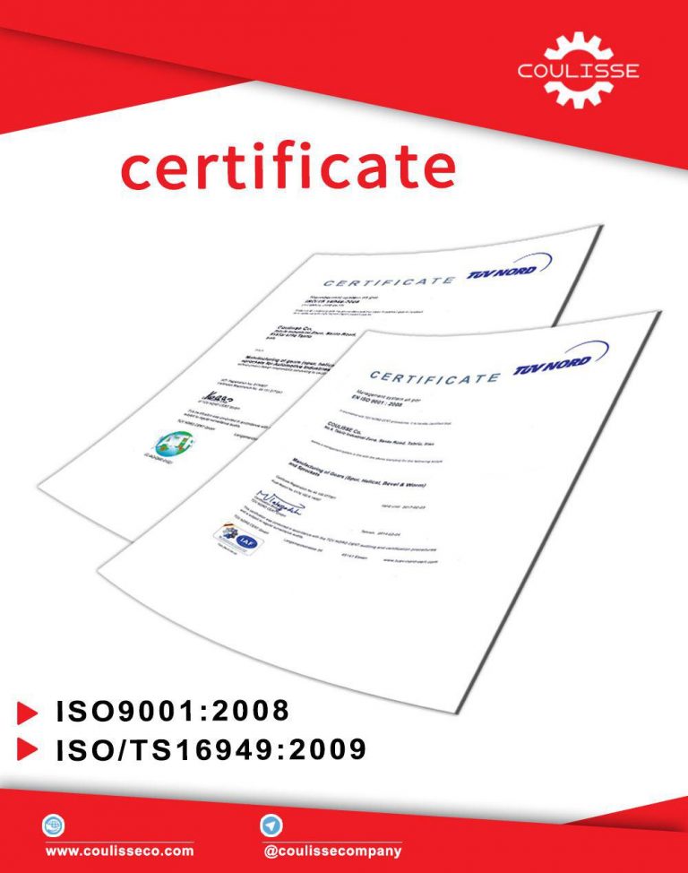 در حال حاضر اين شركت با استقرار الزامات خودروسازان و ارتقا سيستم مديريت كيفيت موفق به اخذ گواهي ISO/TS16949:2009 و ISO9001:2008 از شركت مشاركتي TUVNORD گرديده است. دامنه کاربرد گواهینامه این شرکت بشرح زیر میباشد.